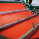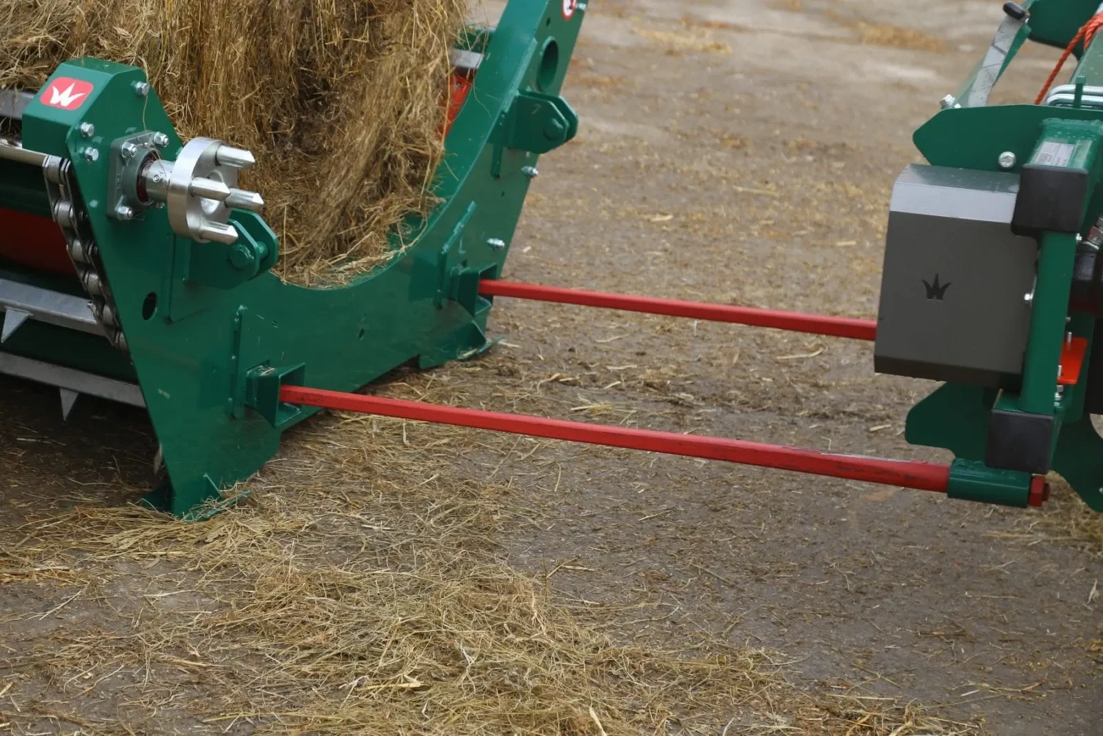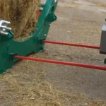 1. First, the feeding cradle is disconnected by the pull of a rope or the innovative preset unlatching system. The tractor or telehandler backs up and picks up the bale, with integrated spikes. It is then lifted onto the feed-bed.